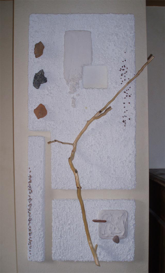 3-teilige Kollage, bei der verschiedene Naturmaterialien in noch feuchten Rauhputz eingebettet wurden.