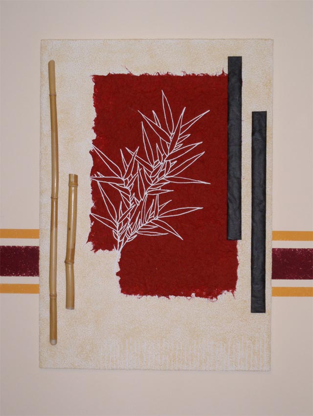 Der ungleichmäßige hellorange Hintergrund wurde durch Auftragen einer Lasur erreicht. Auf den feuchten Hintergrund wurde das rote Bananenpapier aufgebracht. Die schwarzen Balken rechts sind in Japanseide eingeschlagene Holzlättchen. Das Bambusmotiv wurde, ebenso wie die Linien im unteren Bereich, mit weißem Putz aufgespritzt. Der Zweig passt perfekt zur Farbgebung des Zimmers.